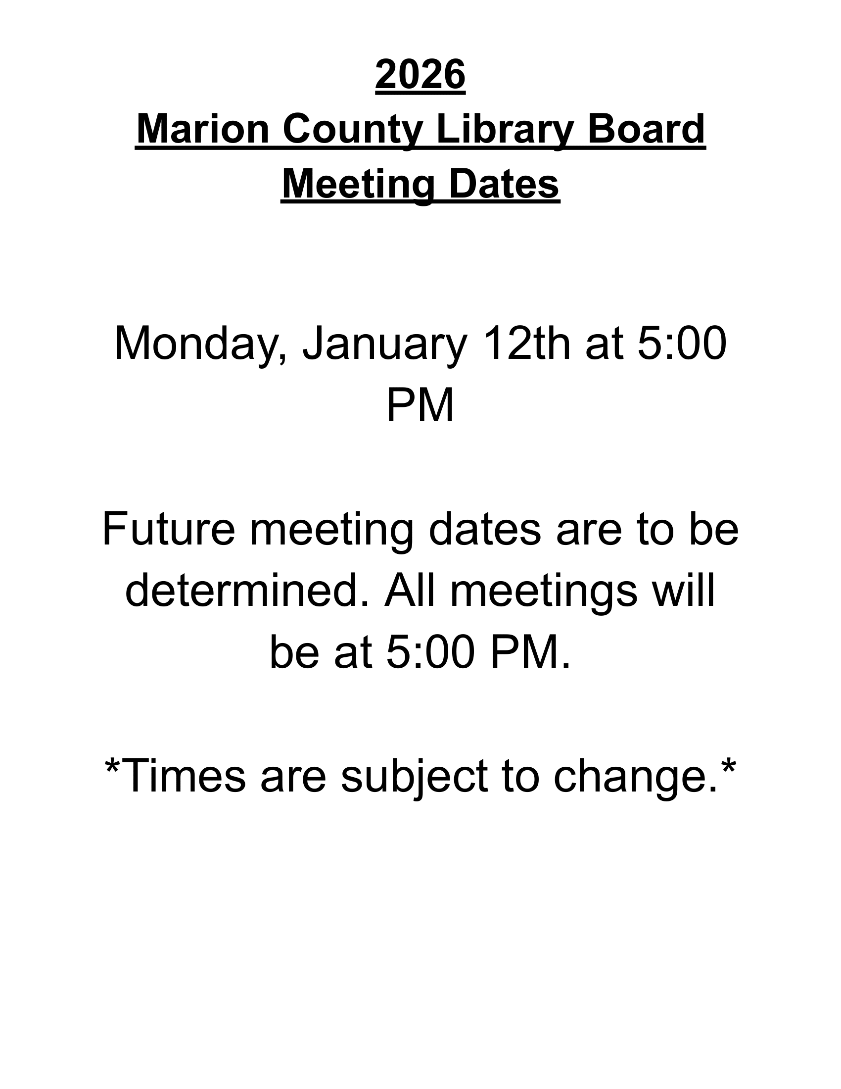 Please note, these meeting times are subject to change, and may not reflect any special or emergency meeting dates.